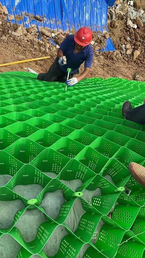 在地麵自然坡度陡於1:5的斜坡上修築路堤時,路堤基底應挖台階,台階寬度不得小於1M時,分期修建或改建公路加寬時,新舊路基填方邊坡的銜接處,應開挖台階,高等級公路台階寬度一般為2M,在每層台階水平麵上鋪設土工格室,利用土工格室自身的立麵側限加筋效應,更好的解決不均勻沉陷的難題。